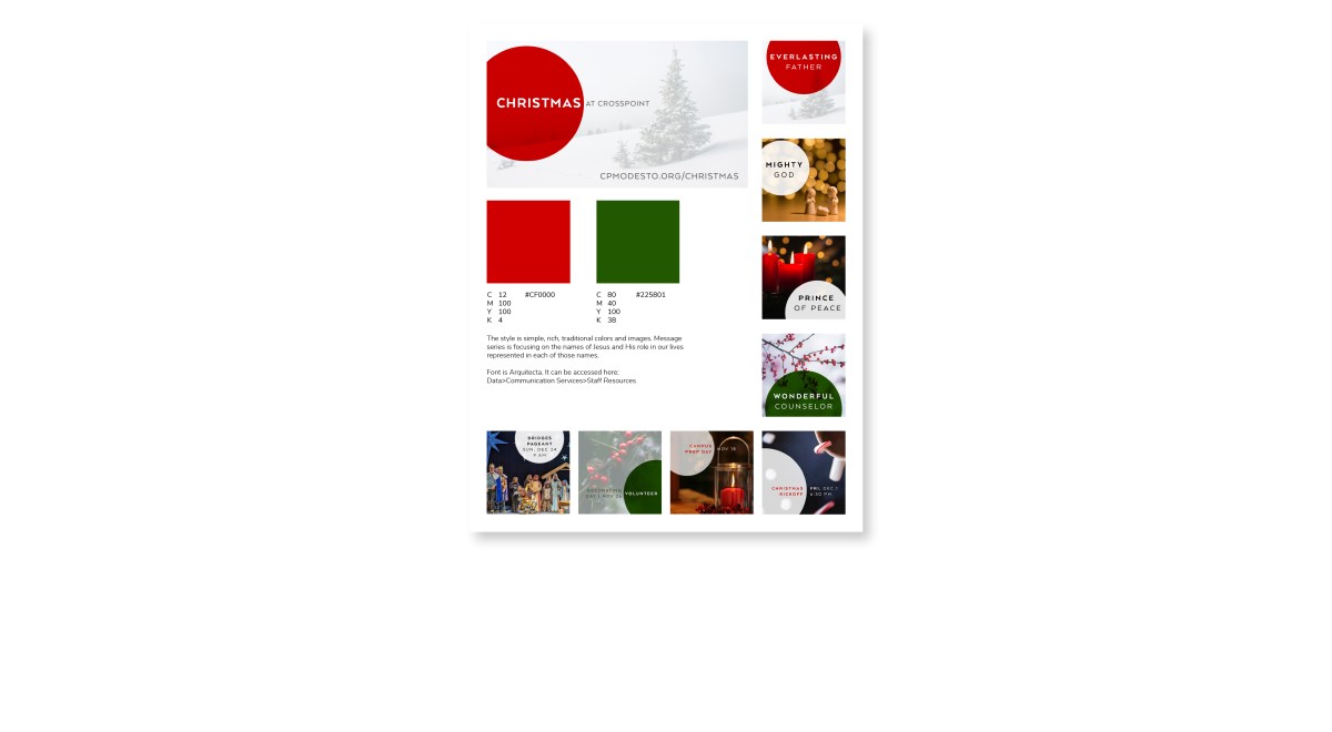 I produced a complete package for promoting all of CrossPoint’s events in the season. This includes series art, printed material, and digital files for website and social media. I also provided a styleguide for the administrative assistants to use when designing material for their ministries, to ensure a consistent look and feel across all communication channels.